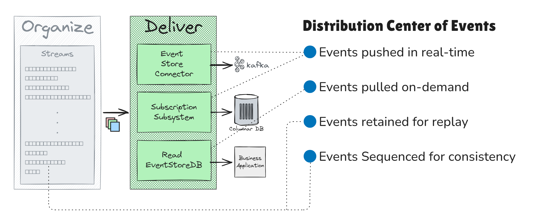 EventStoreDB distributes events efficiently, ensuring: