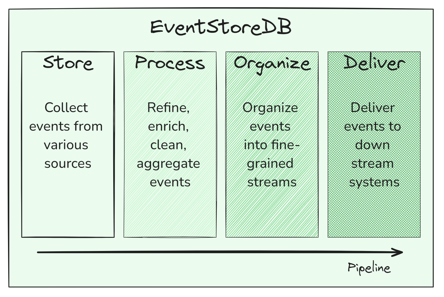In a data pipeline, EventStoreDB performs four major functions: